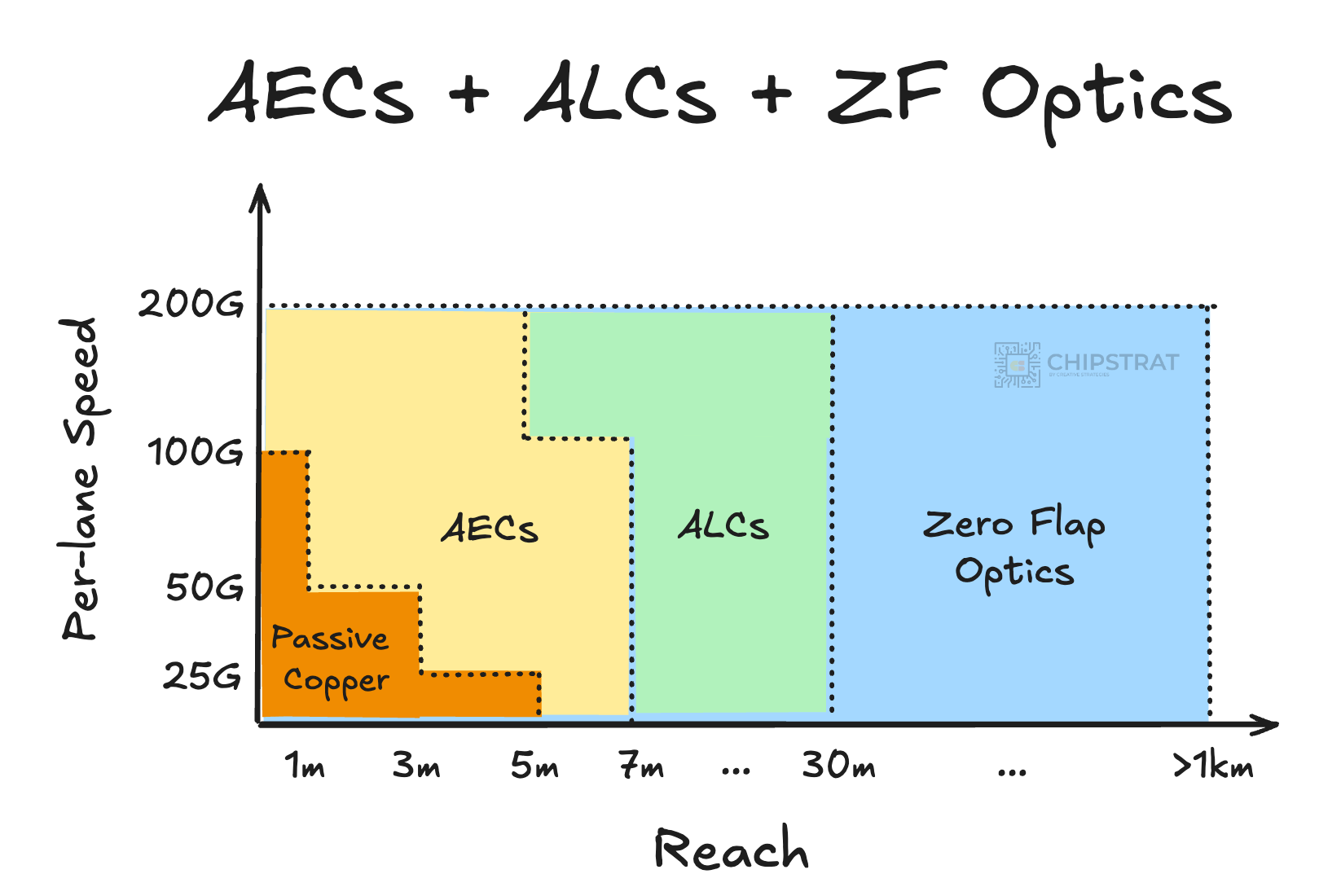 But AECs have a proverbial elephant in the room. The industry is constantly pushing for higher lane speeds, which steadily shortens copper’s reach. Today’s AECs top out around 7 meters, and when the industry upgrades to 200G/lane, AECs only reach ~5 meters. That works inside the rack or adjacent-rack connections, but won’t work for row-level connectivity.