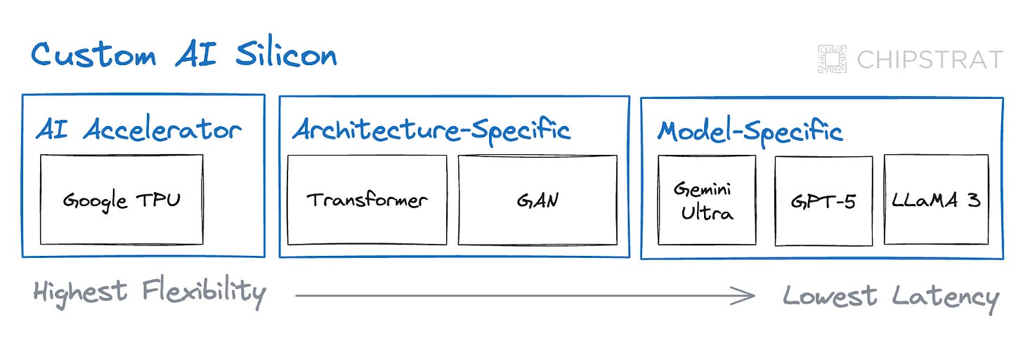 This implies a spectrum in the flexibility and latency of AI silicon, ranging from general AI accelerators with higher latency but greater flexibility to model-specific chips that prioritize achieving the lowest latency.