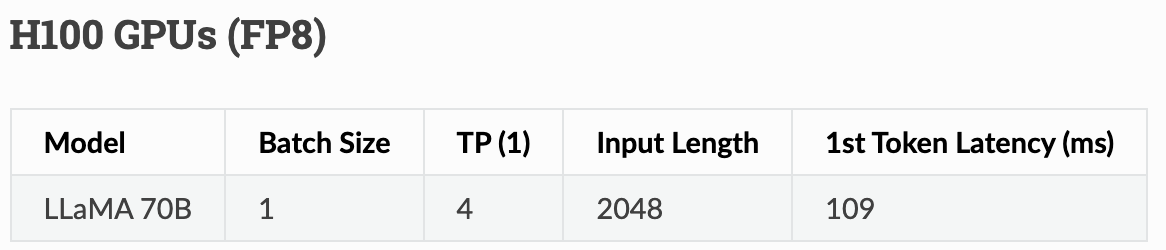 According to NVIDIA, 109ms is the observed time-to-first-token latency12 of FP8 LLaMA running on 4 GPUs with a 2048 input length prompt13 and batch size of 1.