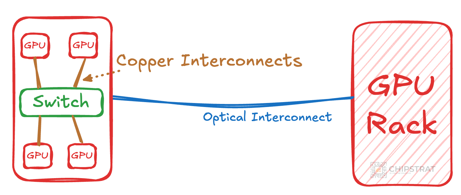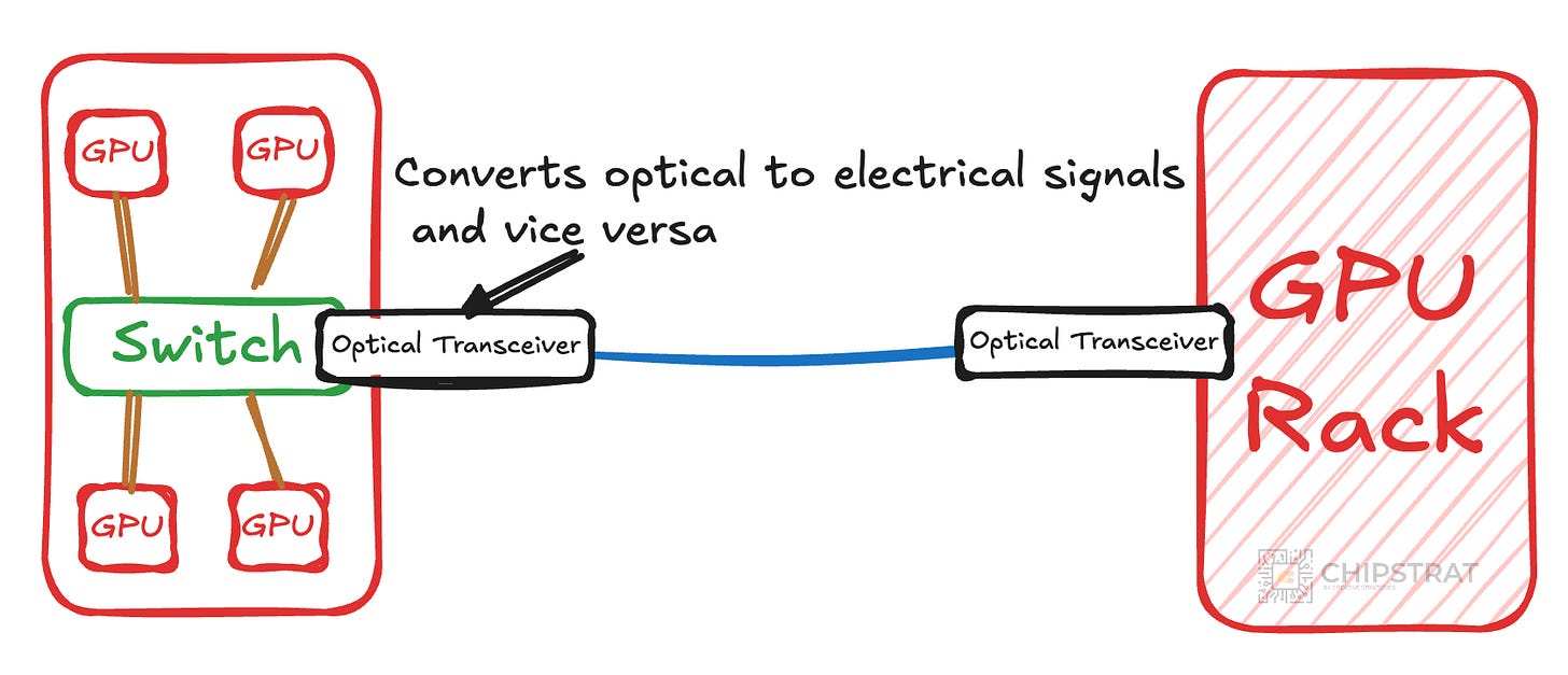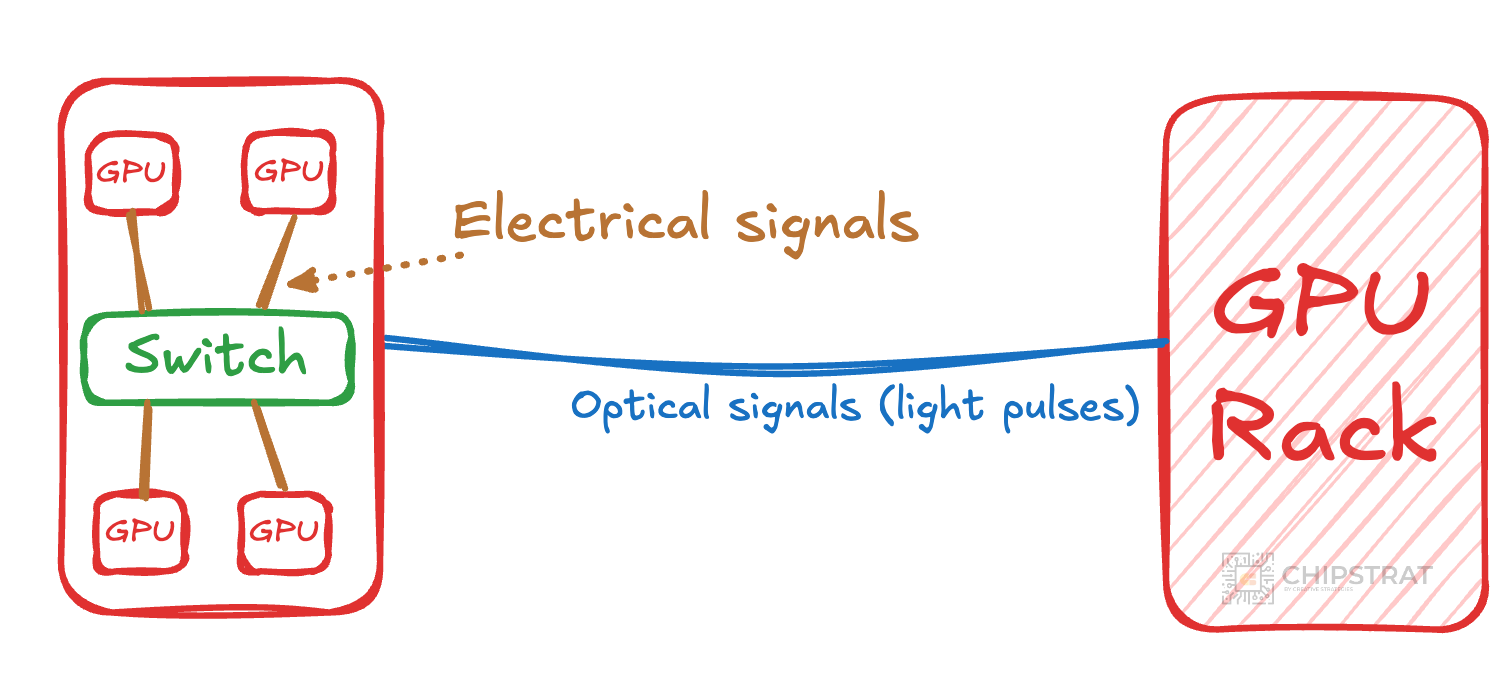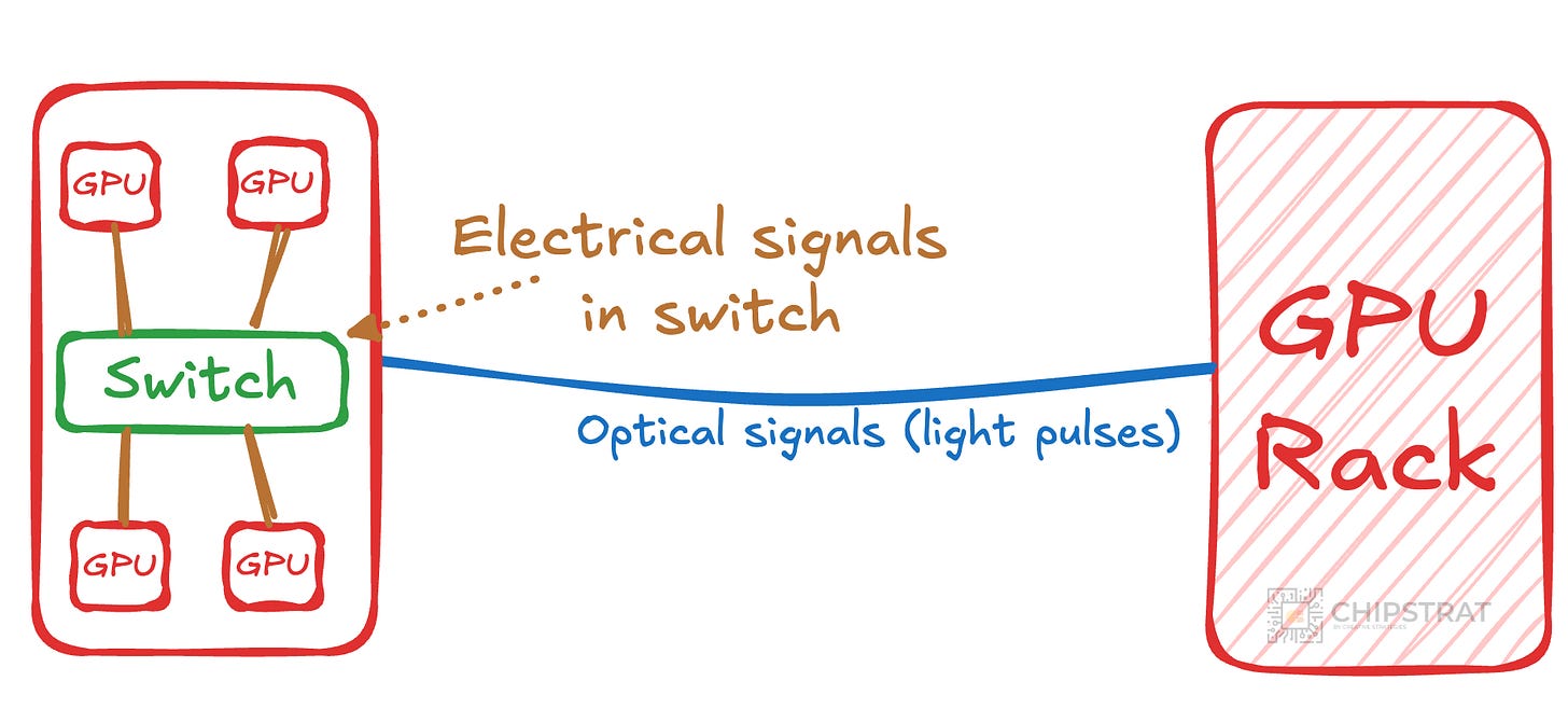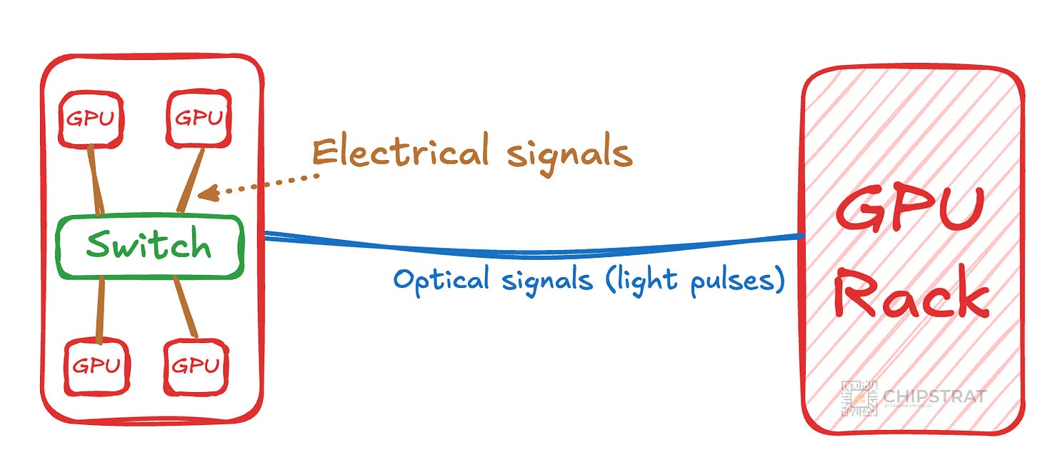 Inside the rack, however, GPUs and switches communicate electrically. Signals travel over short copper traces as high-speed digital electrical signals. Because a rack may contain dozens of GPUs, traffic arriving over fiber must be routed to the correct destination. That routing is done by a switch: