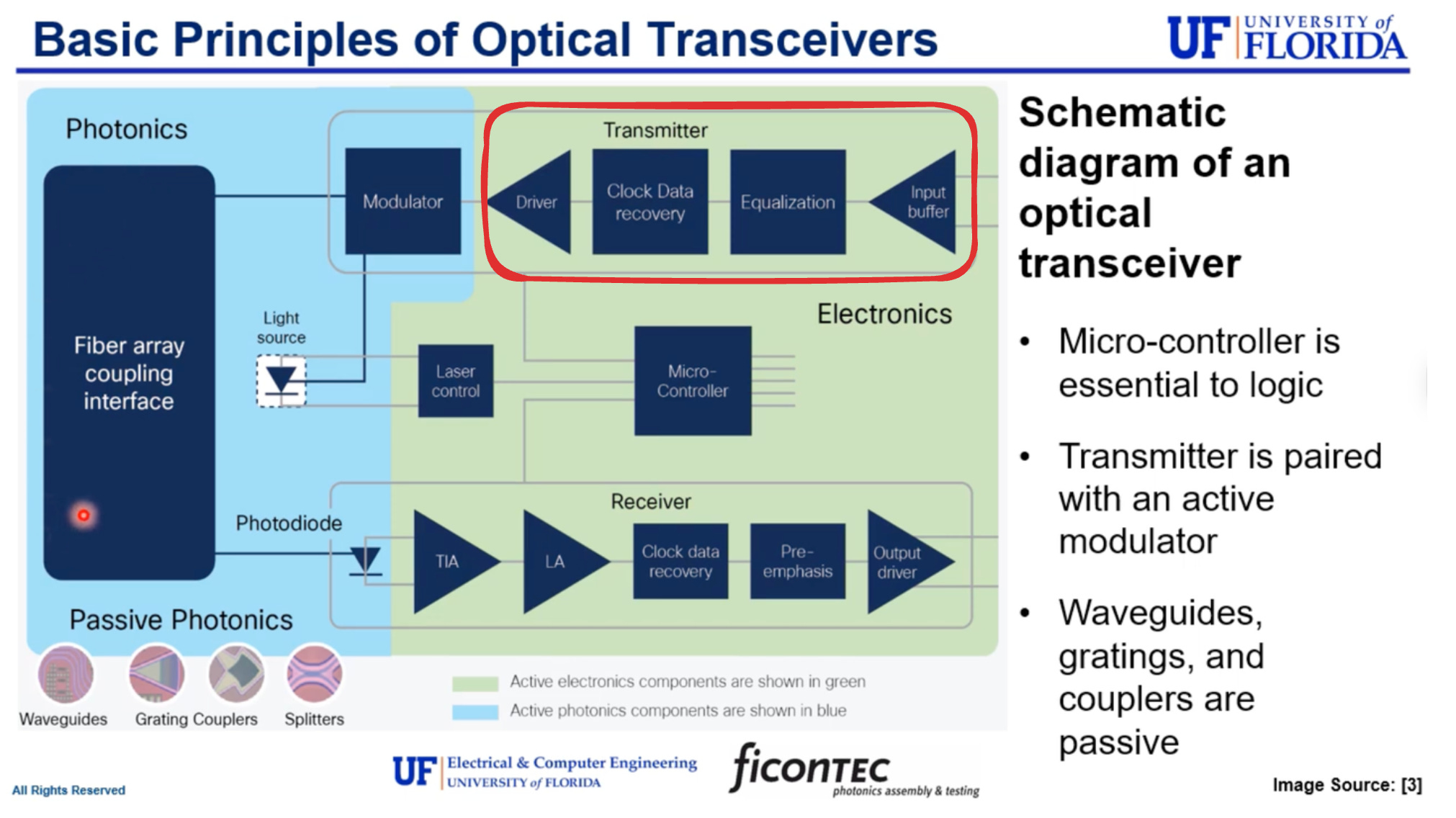 On the receive path, the electrical engine processes the analog signal from the photodiode. It amplifies the tiny electrical current, performs clock and data recovery to extract timing information, applies equalization to compensate for distortion and frequency-dependent loss, and decodes forward error correction to detect and correct bit errors.
