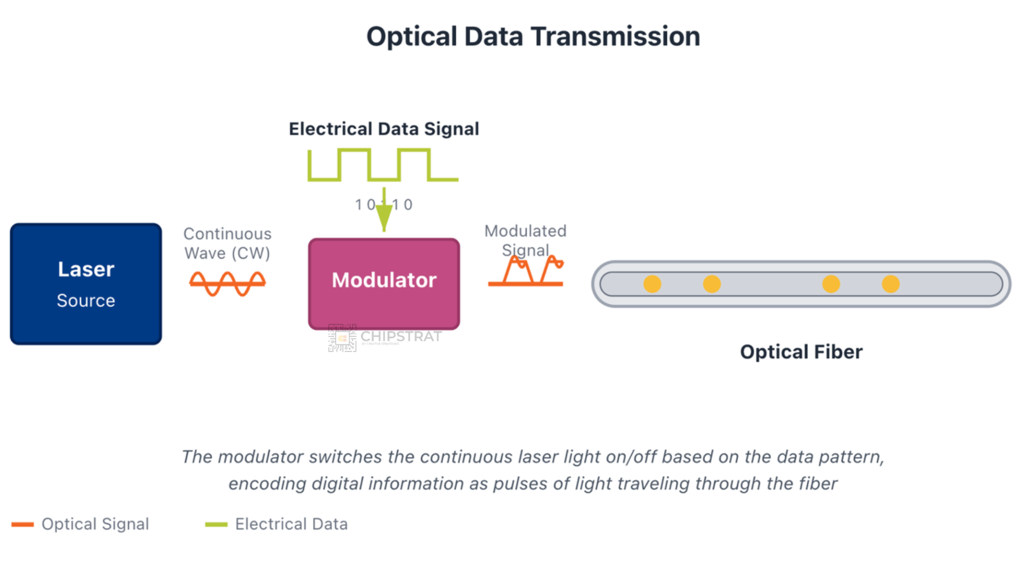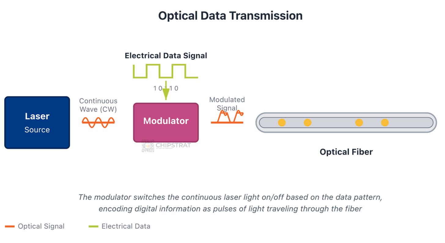 A laser provides a continuous light source, and a modulator encodes outgoing data onto that light for transmission over fiber.