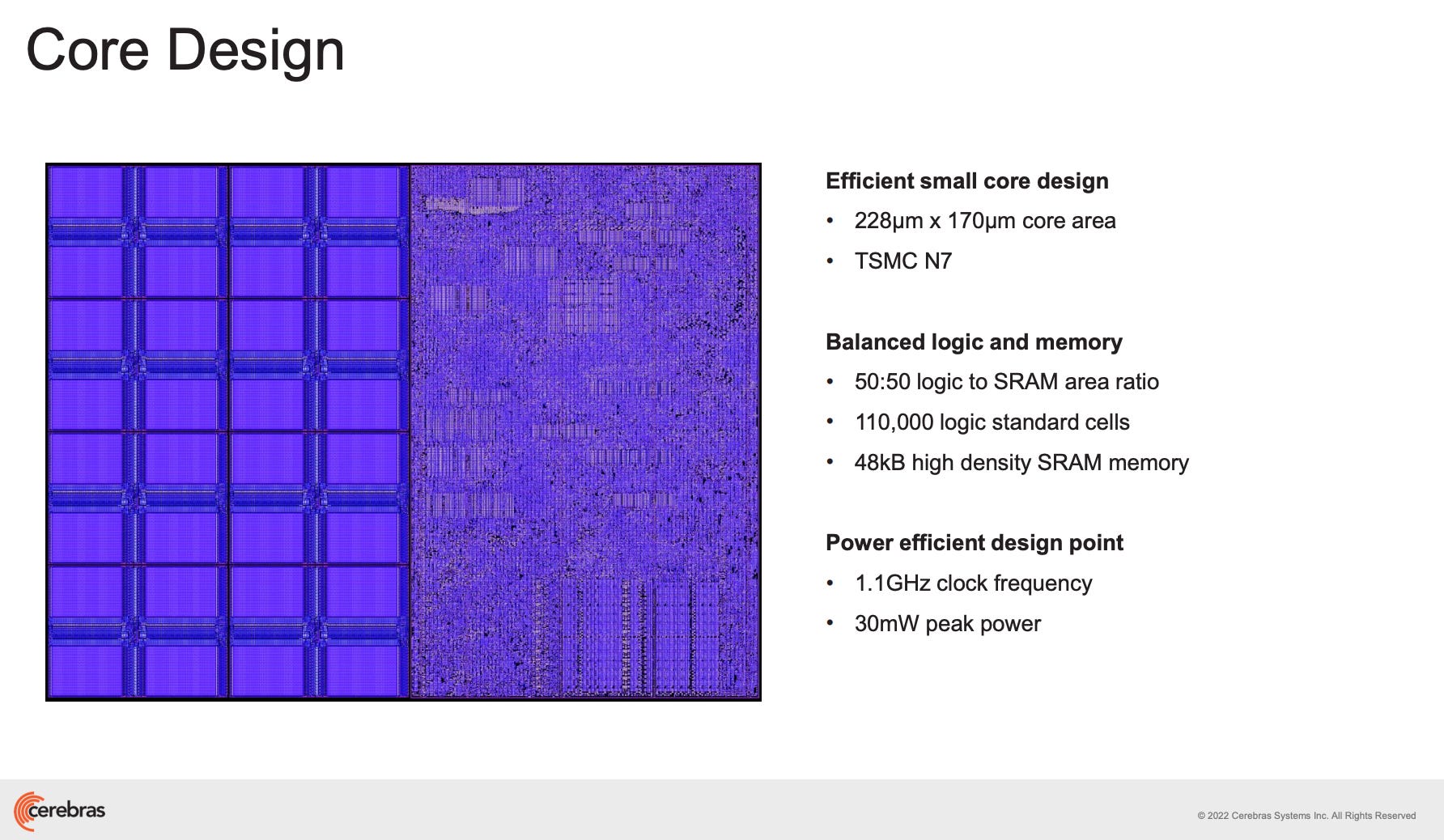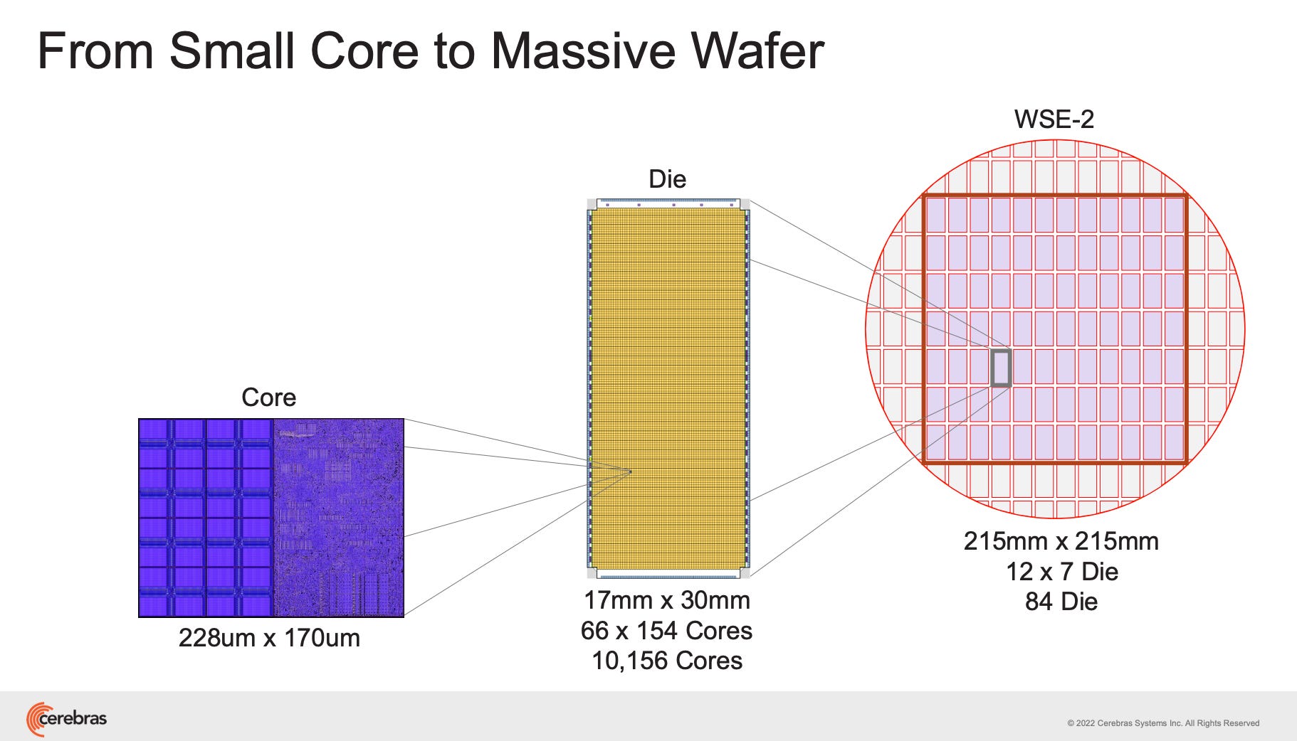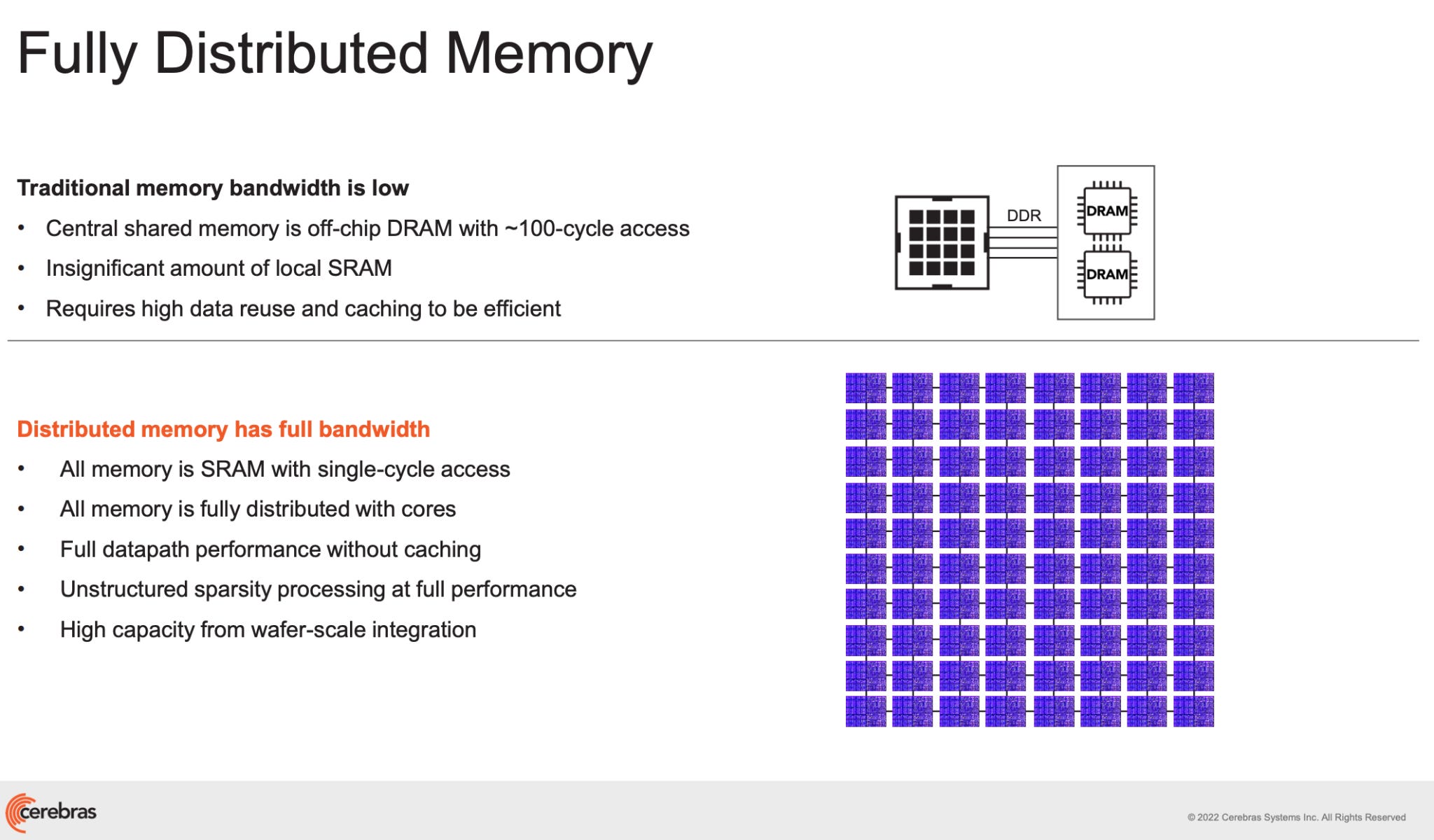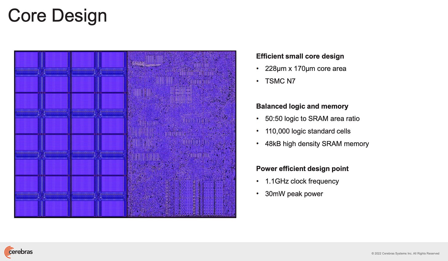 With Cerebras, much more communication occurs on the wafer, avoiding the latency and bottlenecks of off-chip networking. Moreover, SRAM are distributed amongst the die to keep memory as local as possible: