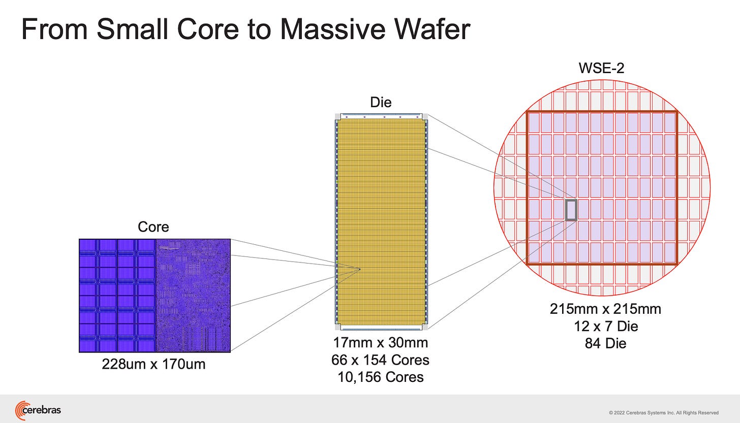 Cerebras, by contrast, is a single, wafer-scale processor with many die integrated into a single piece of silicon: