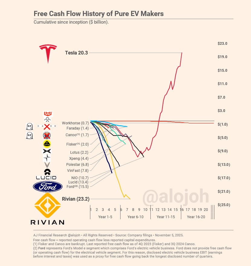 Rivian’s curve is not a boutique OEM stuck in negative FCF. It is a platform company that front-loaded the investment required to replace the legacy supplier stack.