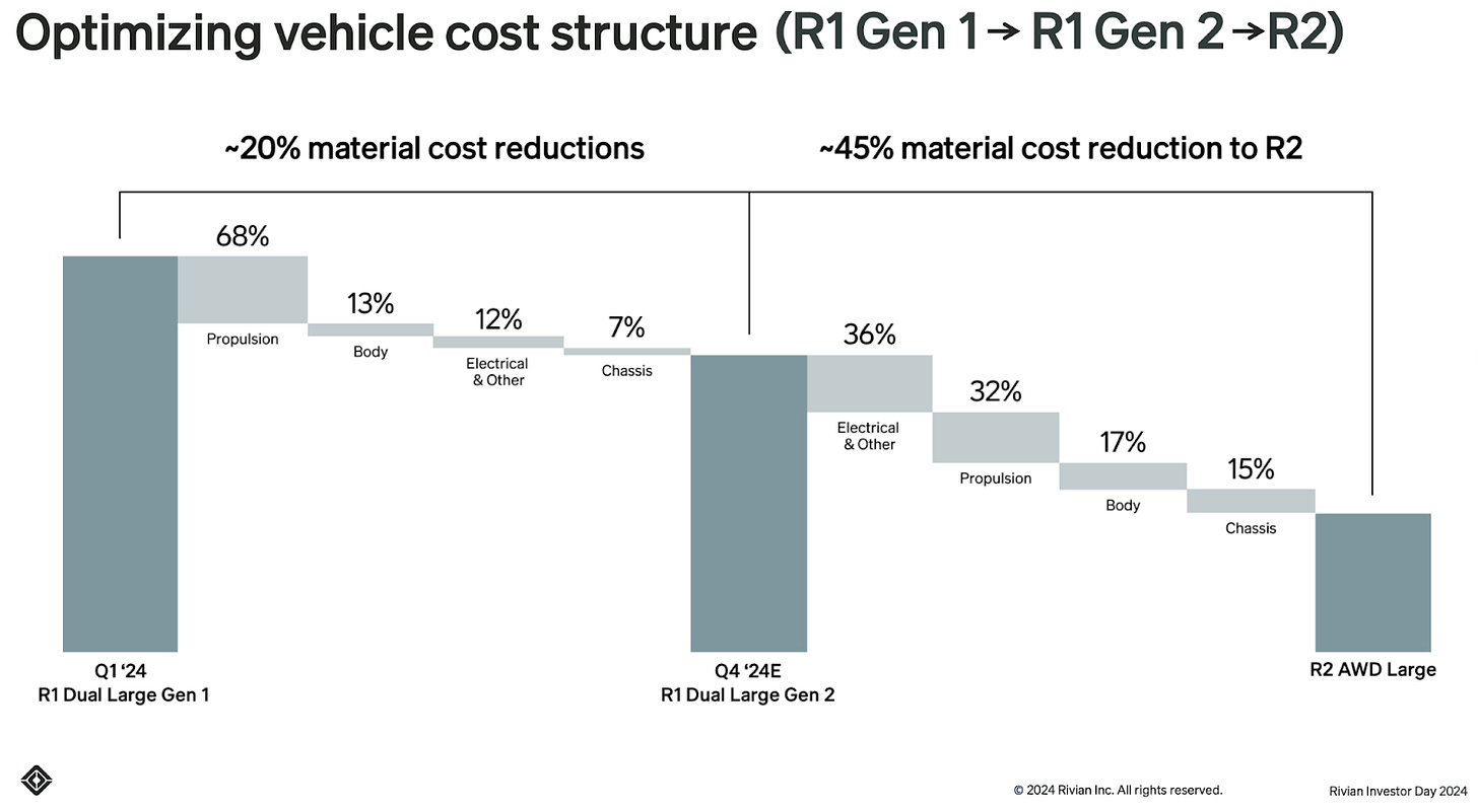 Gen2 and R2 change that, giving Rivian enough demonstrated demand and volume visibility to renegotiate, re-source, and strip out much of the “new entrant” tax from the R1 bill of materials.