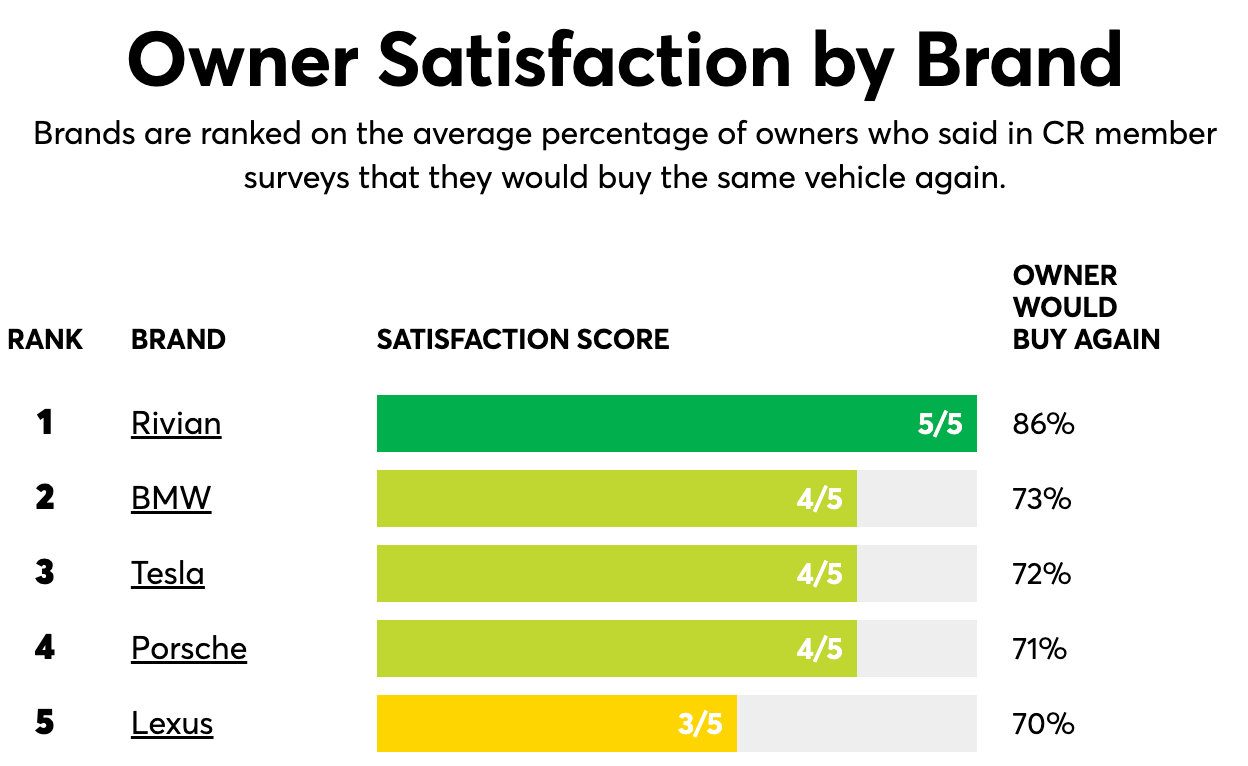RJ: When the R1 launched. we won Vehicle of the Year.. And then Consumer Reports does this annual brand survey, and they look at customer satisfaction, customer appeal, and they look at likelihood to repurchase.