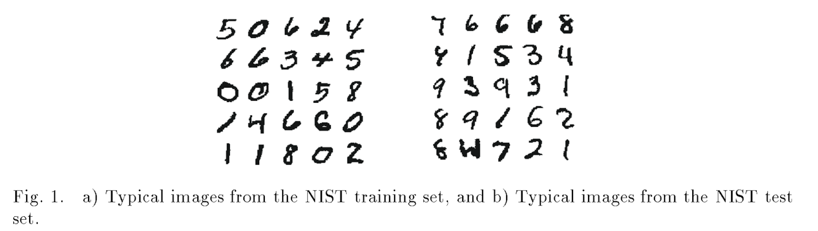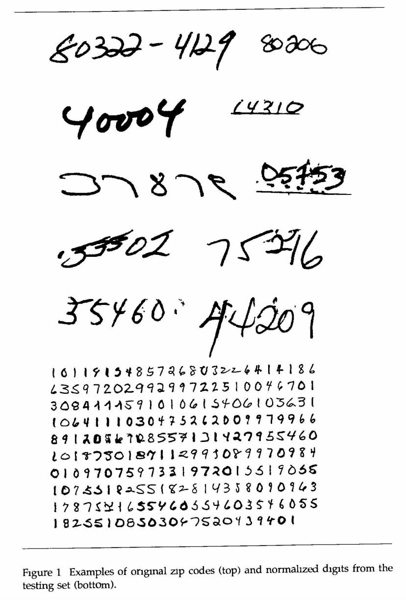The paper describes the shortcomings of that 1989 database of zip codes, namely that the the dataset contained some noisy / unreadable data, the USPS wouldn’t let them distribute it freely for apples-to-apples comparisons, and the dataset became to small as models improved.