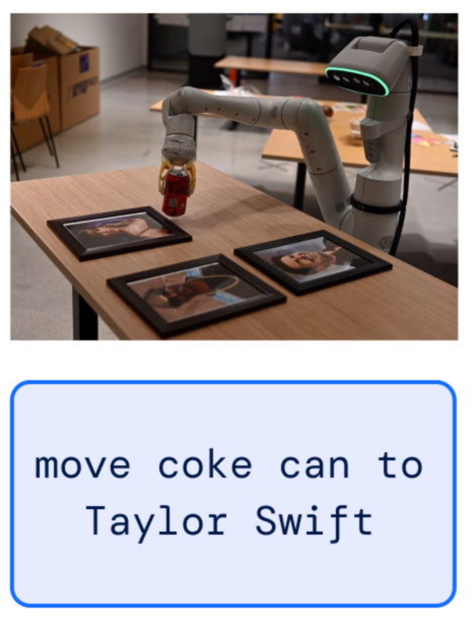 Large vision-language models trained on Internet-scale data dramatically improve robotic generalization. Robots can execute a command like “place the Coke can next to Taylor Swift”: