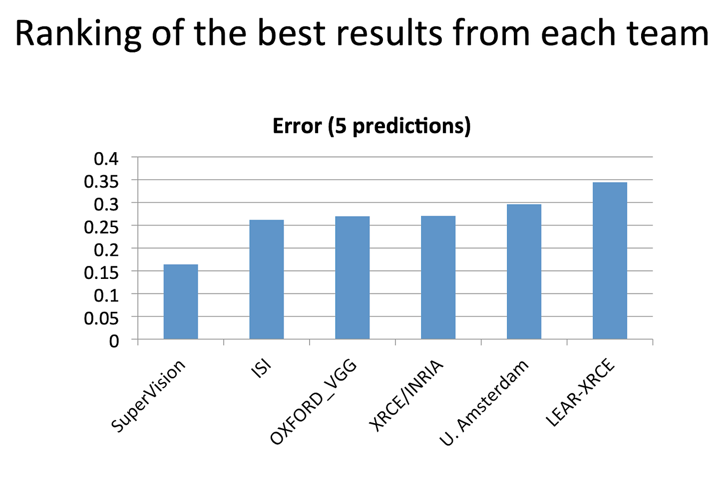Team SuperVision’s neural net dominated the ImageNet 2012 competition: