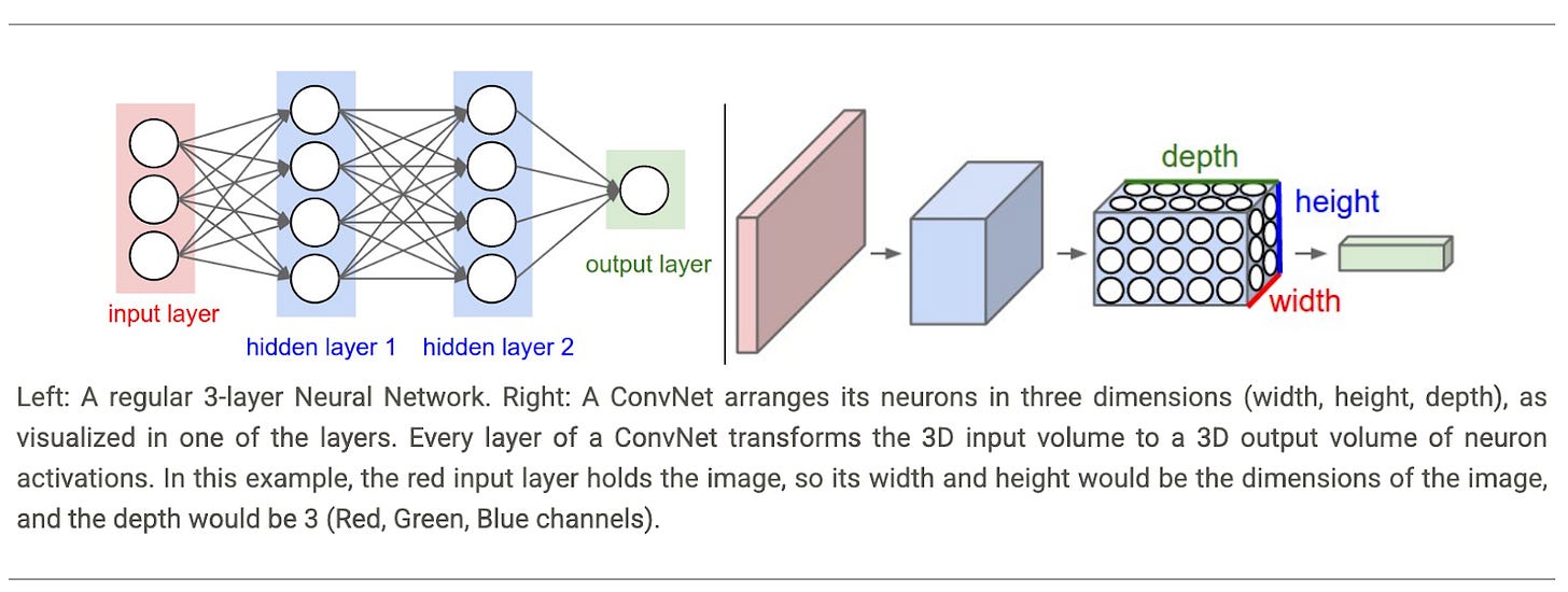 Convolutional Neural Networks take advantage of the fact that the input consists of images and they constrain the architecture in a more sensible way. In particular, unlike a regular Neural Network, the layers of a ConvNet have neurons arranged in 3 dimensions: width, height, depth.