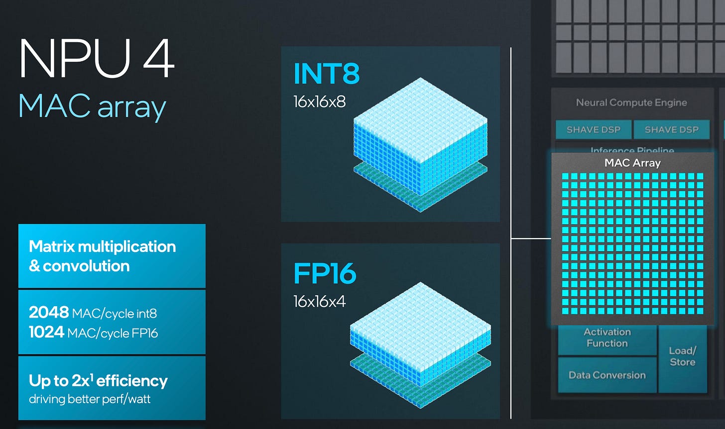 For example Intel’s NPU has a DSP for vector compute and MACs (multiply and accumulate blocks) for matrix math. Lots of info in this video from Intel regarding the Intel NPU architecture and how it runs LLMs: