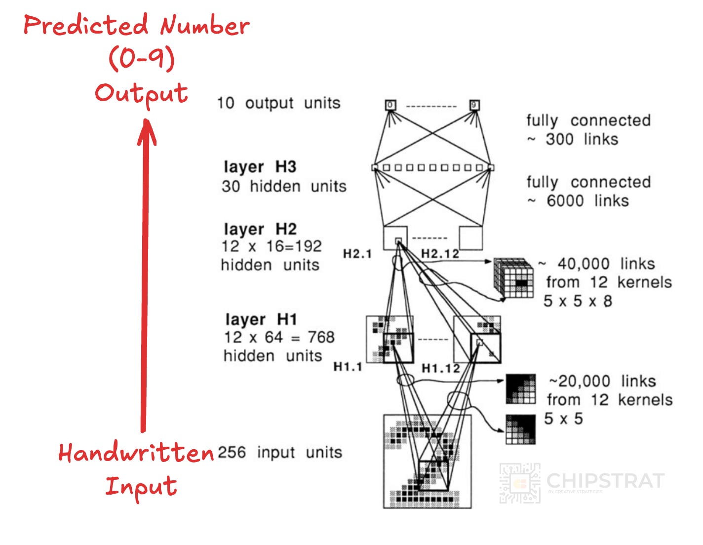 OK, back to Yann LeCun. So the 1989 paper has a nice little diagram to illustrate the neural network architecture, read it from bottom to top:
