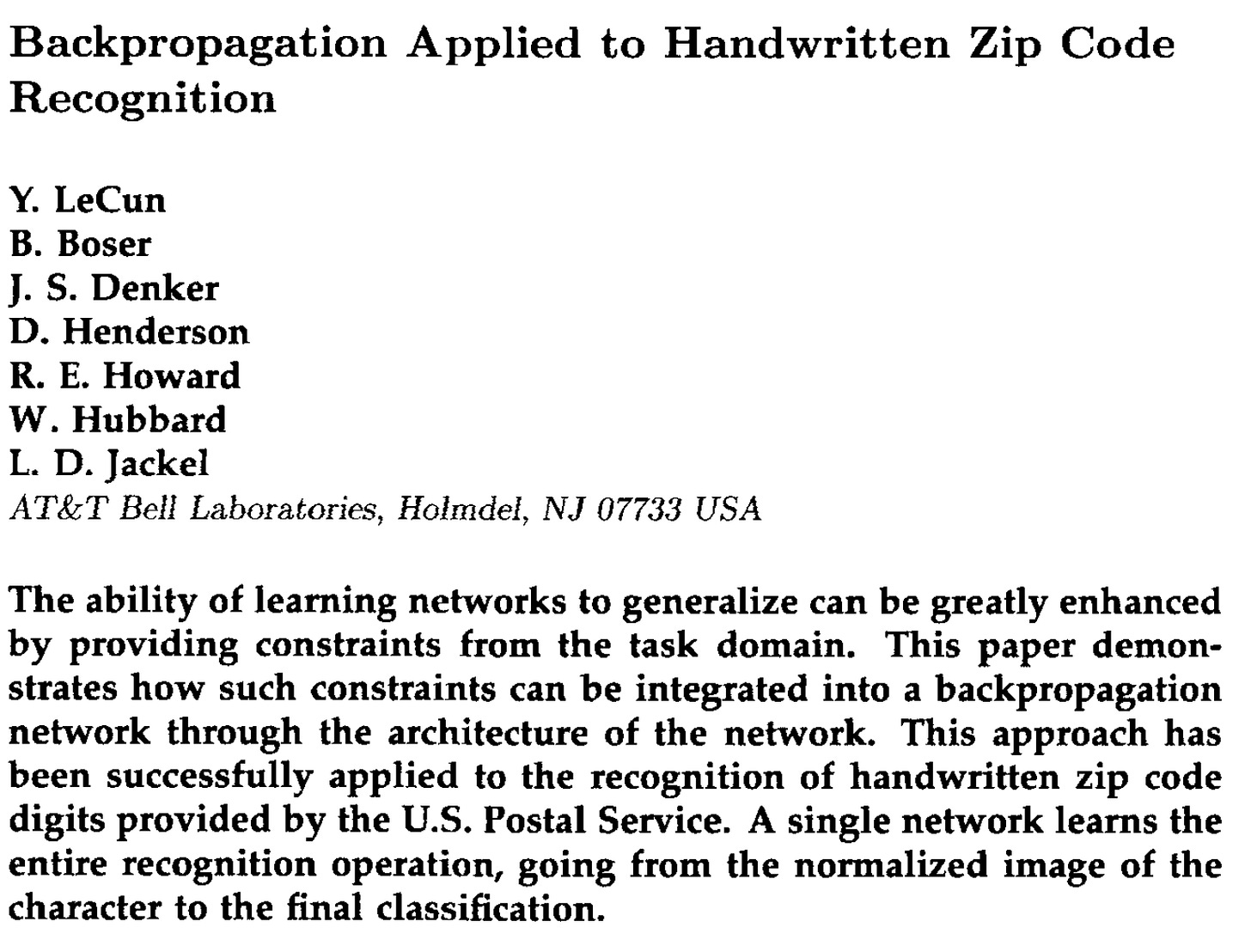 Back in 1989 Yann LeCun and his team at AT&T Bell Labs advanced the field with this beautiful paper: Backpropagation Applied to Handwritten Zip Code Recognition