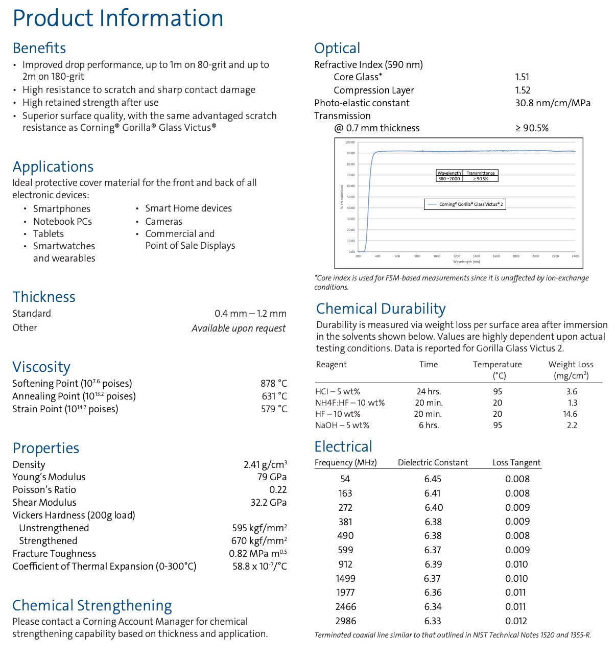 Corning’s Gorilla Glass (Victus® 2) product sheet illustrates a variety of mechanical, optical, chemical, and electrical measurements that are important for consumer device manufacturers: