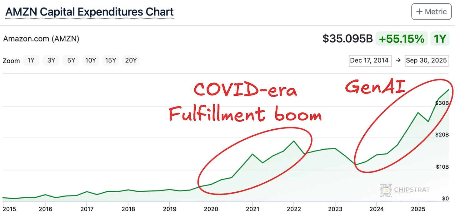 Like Google, Amazon’s quarterly CapEx has skyrocketed since late 2023, but the jump looks less dramatic because Amazon was already spending heavily. Its CapEx broke $10 billion per quarter during the post-COVID logistics buildout, when it doubled fulfillment capacity worldwide: