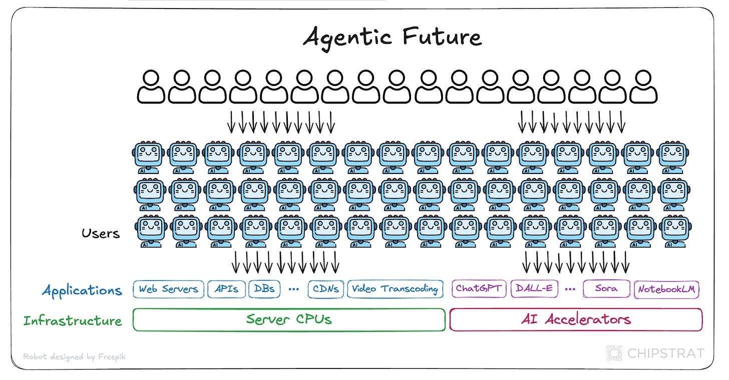 However, in the coming agentic era, a single person may have many agents working for them. So we’ll see an influx of compute consumption from agents: