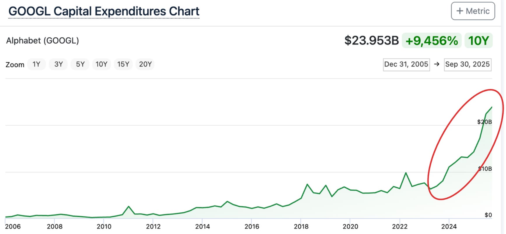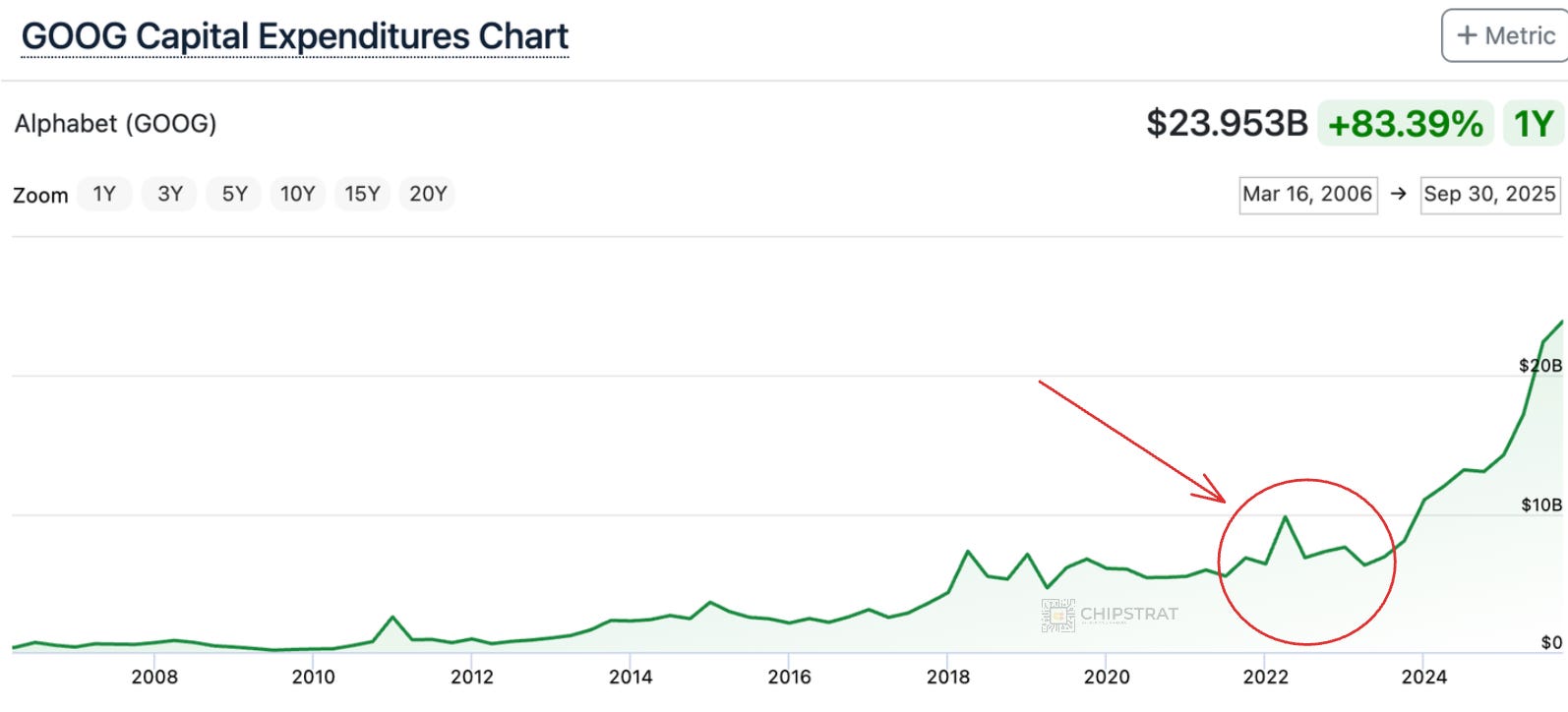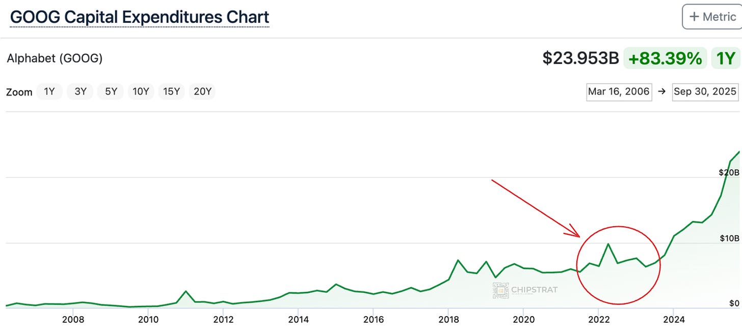 In fact, from IPO up until ChatGPT launch, Google’s quarterly CapEx only once exceeded $8B!