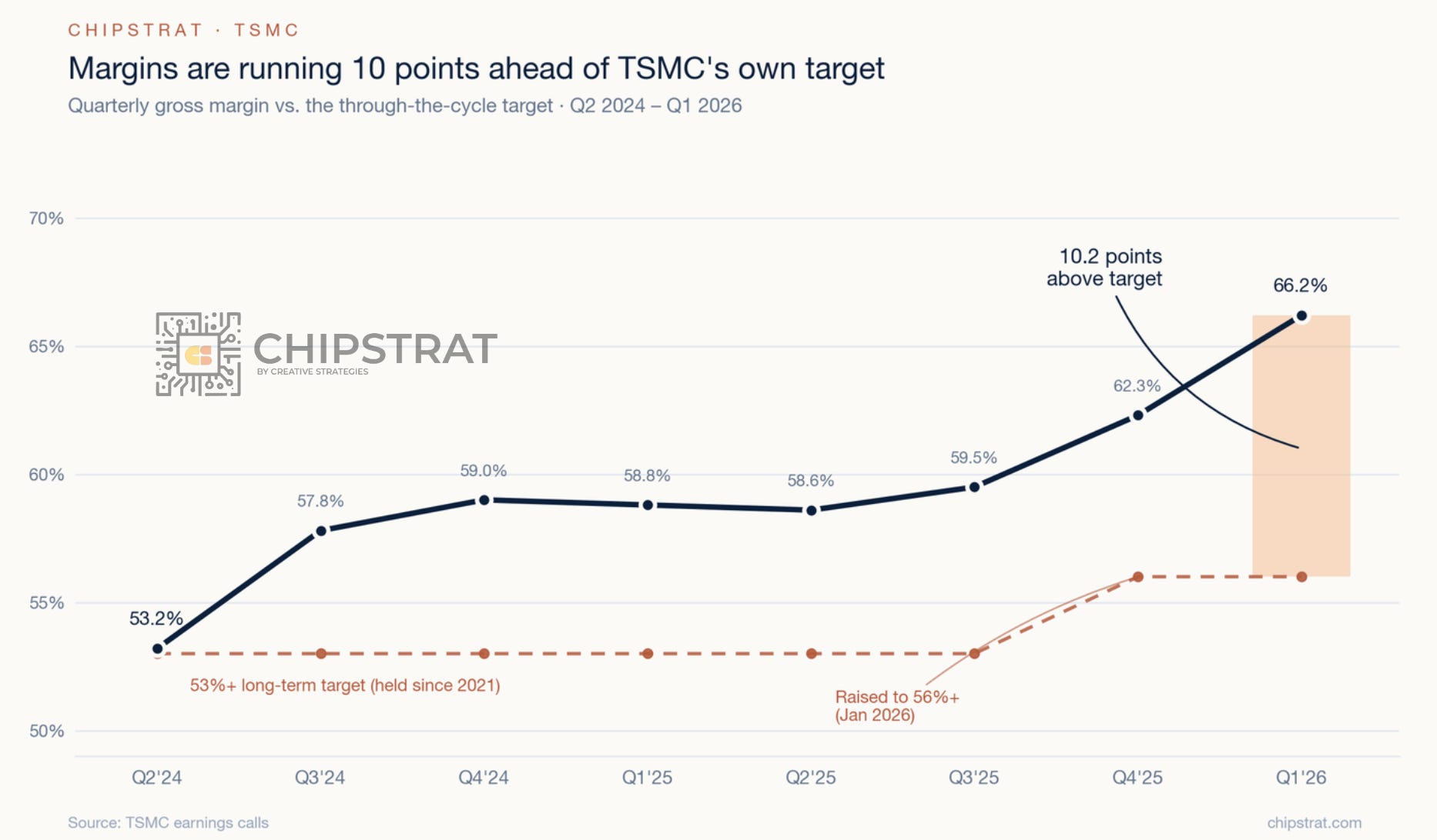 TSMC reported a 66.2% gross margin in Q1, historically its weakest quarter. That result sits well above seasonality and marks the widest spread to its stated long-term margin target on record: