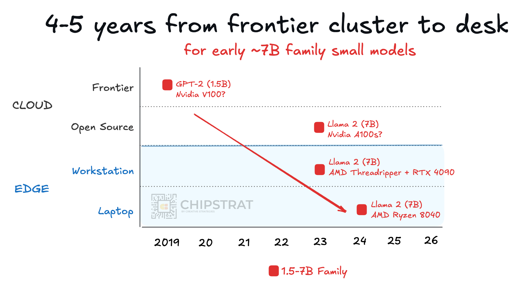 Let’s go back in time to 2024. That year, laptop chip makers were excited to discuss how they could run 7B SLMs on the NPU. GPT-2 era models had finally trickled down from GPU clusters to local machines, roughly five years after their cloud debut: