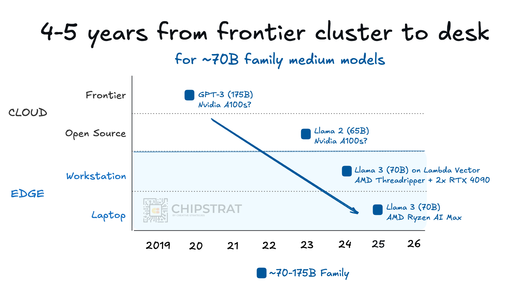 Now fast forward to 2025’s announcements, where useful models finally arrived at the edge, driven by distilled reasoning models and the ability to run up to roughly 70B parameters locally.